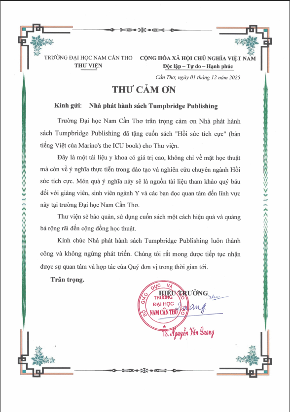 Tumpbridge Intensive Care Medicine Publishing cùng Tumpbridge Publishing vô cùng vinh dự khi ấn bản tiếng Việt của tác phẩm kinh điển "Hồi sức tích cực – Marino’s The ICU Book" đã chính thức có mặt tại kệ sách của Thư viện Trường Đại học Nam Cần Thơ.